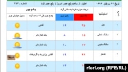 د افغانستان د هوا د حالاتو وړاندوینه چې، د راتلونکې ۲۴ ساعتونو لپاره د افغانستان د هوا پیژندنې د ریاست د راپور پر اساس جوړ شوی دی.